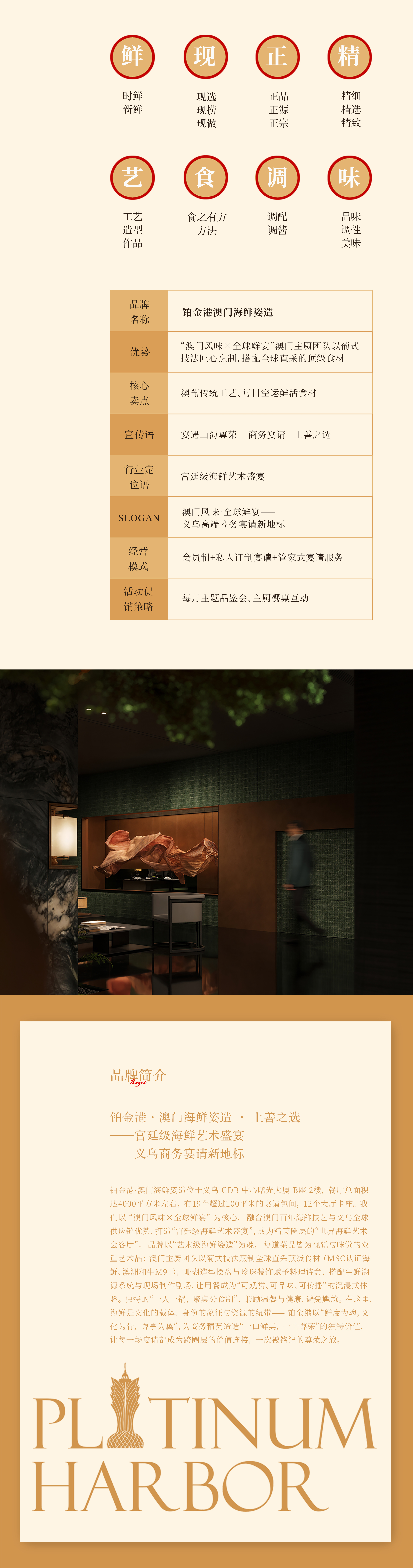鉑金港·澳門海鮮姿造位于義烏CDB中心曙光大廈B座2樓,餐廳總面積達(dá)4000平方米左右,有19個超過100平米的宴請包間,12個大廳卡座。我們以“澳門風(fēng)味×全球鮮宴”為核心,融合澳門百年海鮮技藝與義烏全球供應(yīng)鏈優(yōu)勢,打造“宮廷級海鮮藝術(shù)盛宴”,成為精英圈層的“世界海鮮藝術(shù)會客廳”。品牌以“藝術(shù)級海鮮姿造”為魂,每道菜品皆為視覺與味覺的雙重藝術(shù)品:澳門主廚團(tuán)隊(duì)以葡式技法烹制全球直采頂級食材(MSC認(rèn)證海鮮、澳洲和牛M9+),珊瑚造型擺盤與珍珠裝飾賦予料理詩意,搭配生鮮溯源系統(tǒng)與現(xiàn)場制作劇場,讓用餐成為“可觀賞、可品味、可傳播”的沉浸式體驗(yàn)。獨(dú)特的“一人一鍋,聚桌分食制”,兼顧溫馨與健康,避免尷尬。在這里,海鮮是文化的載體、身份的象征與資源的紐帶——鉑金港以“鮮度為魂,文化為骨,尊享為翼”,為商務(wù)精英締造“一口鮮美,一世尊榮”的獨(dú)特價(jià)值,讓每一場宴請都成為跨圈層的價(jià)值連接,一次被銘記的尊榮之旅。